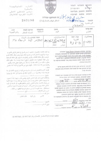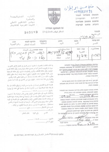 بحجة البناء دون ترخيص في المناطق المصنفة (ج) قامت قوات الاحتلال بتسليم اخطارات بوقف البناء والهدم لعدد من المنازل والمنشآت في منطقة واد الناقة الى الغرب من بلدة اذنا حيث تسلم المواطن علاء عيد البطران اخطارا بوقف البناء لمنزله قيد الانشاء بمساحة 150م في حين تسلم المواطن خليل حسين البطران اخطارا بوقف البناء لمنزلة المكون من طابق واحد في ذات المنطقة بمساحة 100م وكذلك تسلم المواطن اشرف محمد البطران اخطارا بوقف البناء لبركس اغنام بمساحة 200م ، وتقوم قوات الاحتلال بإصدار الاخطارات والقائها بشكل عشوائي بجوار المنازل دون علم اصحابها علما بان قوات الاحتلال قامت بتوجيه العديد من الإخطارات في ذات المنطقة سابقا وتتعرض المنطقة لمضايقات قوات الاحتلال بشكل مستمر .