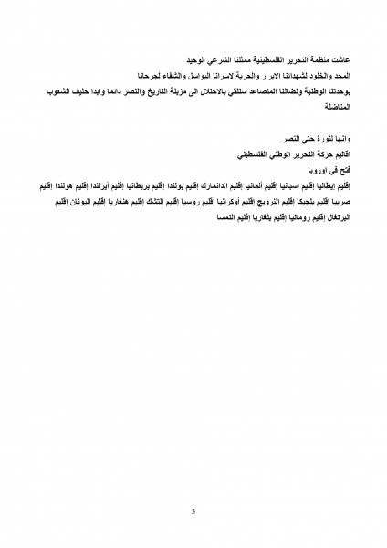 اننا ندعوا كافة ابناء الشعب الفلسطيني والجاليات العربية والاسلامية المتواجدة في اوروبا التأهب والاستعداد للفعاليات الاحتجاجية لنقف وقفة الاحرار مع القدس ومع الشعب الفلسطيني في نضالة المستمر ضد الاحتلال والاستيطان الصهيوني من اجل القدس عاصمتنا الابدية.