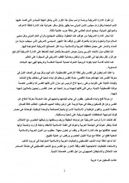 ان حركة فتح وابناء فلسطين يقفون الى جانب قيادتهم وشعبهم في هذه المعركة معركة الدفاع عن القدس وعن كل فلسطين وحقنا في حياة كريمة على ارض وطننا الحبيب فلسطين، لنطالب كافة فصائل منظمة التحرير والقوى الوطنية و الاسلامية الاسراع بانجازالمصالحة والوحدة الوطنية، فوحدتنا هي مصدر قوتنا لمواجهة المخططات الصهيوامريكية على شعبنا ومستقبله.