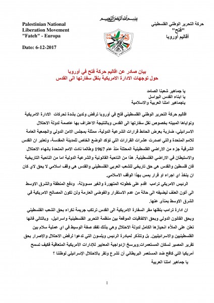 اقاليم حركة التحرير الوطني الفلسطيني فتح في أوروبا ترفض وتدين بشدة تحركات الادارة الامريكية ونواياها المبيته بخصوص نقل سفارتها الى القدس وبالنتيجة الاعتراف بها عاصمة لدولة الاحتلال الاسرائيلي، ضاربة بعرض الحائط قرارات الشرعية الدولية، ممثلة بمجلس الامن الدولي والجمعية العامة للامم المتحدة والتي اصدرت عشرات القرارات التي تؤكد الوضع الخاص للمدينة المقدسة، وتعتبر ان القدس الشرقية جزء من الاراضي الفلسطينية المحتلة منذ عام 1967 وطالما نادت الامم المتحدة بانهاء الاحتلال والاستيطان في الاراضي الفلسطينية.