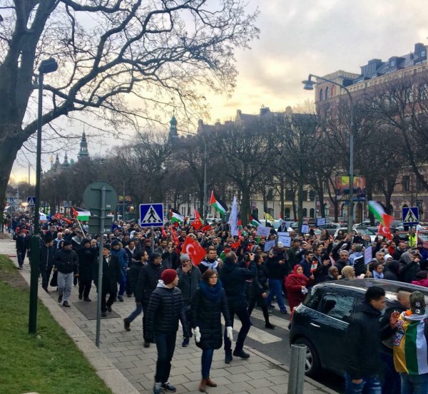 وكانت مسيرة جماهيرية حاشدة جابت شوارع العاصمة ،رفعت فيه الاعلام الفلسطينية واليافطات المنددة بسياسة ادارة ترامب تجاه القضية الفلسطينية ، وهتفت الحناجر بالحرية لفلسطين ، وبالنصر للشعب الفلسطيني الذي يواجه الاحتلال لليوم الرابع على التوالي في كافة المدن الفلسطينية ، وخصوصا العاصمة القدس التي يتواجد المرابطون فيها يوميا للدفاع عن المقدسات الاسلامية والمسيحية وقال رئيس لجنة القدس السويدية الاستاذ فيتكور سماعنه إ ن رسالتنا قد وصلت اليوم من خلال المسيرة الجماهيرية التي جابت شوارع ستوكهلم لتنتهي امام مبنى السفارة الأمريكية لنقل رسالة للقيادة الامريكية المتحيزة للاحتلال التي اسقطت عنها دور الوسيط والراعي للسلام الى مناصر الى ارهاب الاحتلال والاختراق الواضح للقانون الدولي والقانون الدولي الإنساني، وحقوق الانسان.