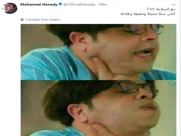 يظهر هنيدي في الصورتين وهو يعبر عن ضيقه، في إشارة إلى أن عام 2017 لم تكن أحداثه سعيدة بالقدر الكافي، وكتب "مع السلامة 2017 ، كنتي سنة جميلة وخفيفة وهادية".