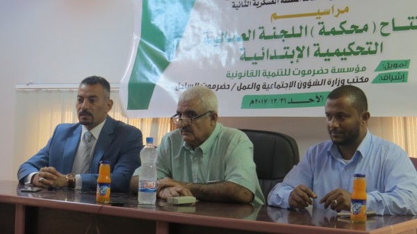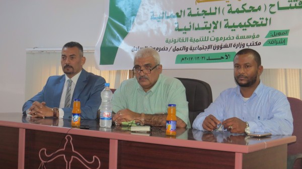 افتتح وكيل محافظة حضرموت لشؤون مديريات الساحل والهضبة الدكتور سعيد عثمان العمودي بمعية الأستاذ هاني عبدالله البيض المدير العام لمكتب وزارة الشؤون الإجتماعية والعمل مدير مكتب إدارة شؤون المنظمات الدولية والقاضي هاشم الجفري رئيس محكمة إستئناف محافظة حضرموت والمحامي عمار العماري رئيس اللجنة التحكيمية صباح اليوم الأحد مقر محكمة اللجنة العمالية التحكيمية الإبتدائية في مكتب وزارة الشؤون الإجتماعية والعمل - ساحل حضرموت - بتمويل مؤسسة حضرموت للتنمية القانونية .