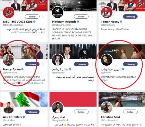 اطلاع خاص على حسابات الفنانين والفنانات، تبيّن بأنّ الحساب الرسمي للفنان كاظم الساهر يقوم بمتابعة حساب الفنانة اللبنانية نانسي عجرم عبر مواقع التواصل الاجتماعي، لتكون هي الوحيدة من بين الفنانات اللبنانيات اللواتي يتابع حسابهن الساهر، أما من بين الفنانات المصريات فقد اختار الحساب الرسمي للفنانة شيرين عبد الوهاب فقط.