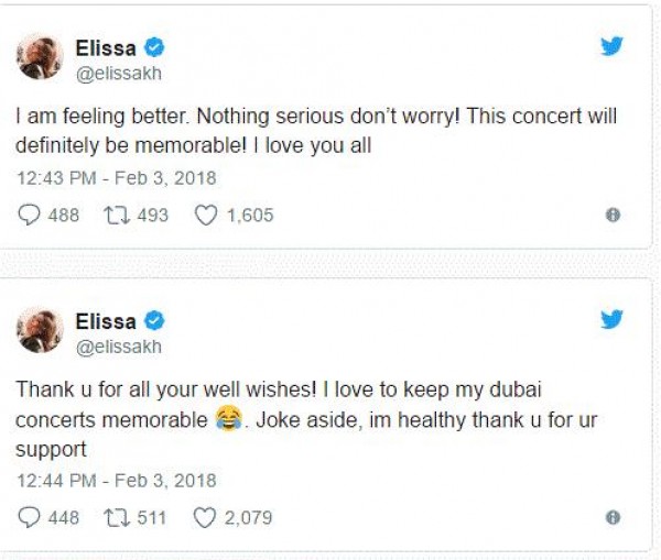 فقد غردت اليسا عبر حسابها على تويتر باللغة الانكليزية شاكرة الجميع وقالت: "اشعر بتحسن، لا شيء جدي فلا داعي للقلق.. هذه الحفلة لن تنسى، احبكم جميعا".