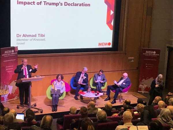وفي مداخلته، الى جانب السفير الفلسطيني في لندن مانويل حسسيان ودانيئيل ليڤي وناديا حجاب، امام المؤتمر الذي حضره حشدّ من الفلسطينيين المقيمين في لندن وناشطين اجانب وسياسيين بريطانيين علّق النائب د. أحمد الطيبي على قرار ترامب بنقل السفارة الأمريكية من تل ابيب الى القدس والاعتراف بالقدس عاصمة لإسرائيل بأن "هذا القرار هو اطلاق النار على رأس حل الدولتين وانهاء وقتل لعملية السلام. التصرف الخطير جدا الذي قام به ترامب هو تعامله مع قضية القدس وكأنها شأن داخلي اسرائيلي، وأن دور الولايات المتحدة التي لم تكن وسيطا منصفا يوما ما، اصبحت الان وسيطة بين البيت اليهودي والليكود.. بين نتنياهو ونفتالي بينط. واعلان ترامب مؤخرا بنقل السفارة في شهر ايار الى القدس يعطي الانطباع وكأن هناك صديق يحاول مساعدة صديق له يقبع تحت التحقيقات وموجود في ضائقة ضاربين بعرض الحائط تبعات هذا الفعل الخطير وانعكاسه على عملية السلام بين الفلسطينيين والاسرائيليين".