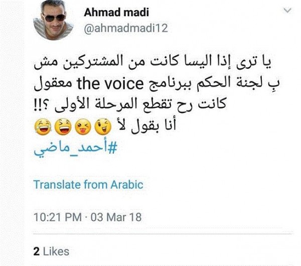 شن الشاعر اللبناني أحمد ماضي، هجومًا حادًا على الفنانة اللبنانية إليسا، بعد عرض الحلقة الماضية من برنامج "The Voice"، حيث "يا ترى إذا إليسا كانت من المشتركين مش بِ لجنة الحكم ببرنامج the voice معقول كانت رح تقطع المرحلة الأولى ؟!! أنا بقول لأ".