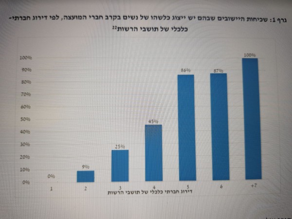 كشف البحث الخاص الذي تمّ اعداده خصيصًا لهذا اليوم عن معطيات مقلقة حول تمثيل النساء في الحكم المحلي حيث أكد التقرير انه اليوم في إسرائيل نسبة تمثيل النساء في عضويّة الحكم المحلي اقل بكثير من نسبتهن في المجتمع ولا تتجاوز ال 14% ومن بين 201 سلطة محليّة ومدينة فقط في أربع منهن ترأسها نساء. واظهر التقرير ايضّا ان نسبة النساء من كافة المتنافسين في الانتخابات الأخيرة (رئاسة وعضوية) لا تتجاوز ال-20% ومن كافّة النساء اللواتي تنافسن فقط 9% نجحن بالفوز بثقة الناخبين.