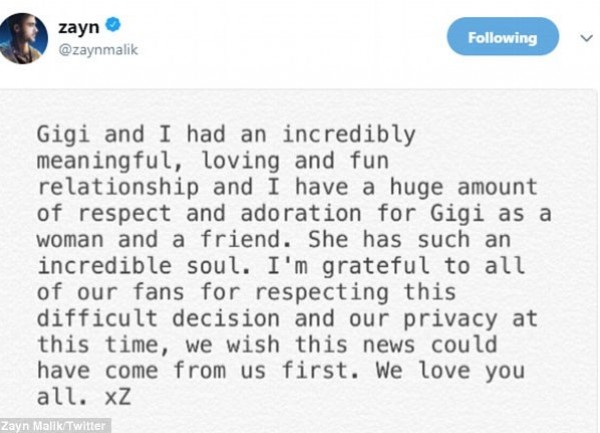 وكان المطرب العالمي، البالغ من العمر 25 عاما، قد نشر صورة له عبر حسابه الشخصى على موقع التواصل الاجتماعى "إنستجرام"، يظهر فيها محاولاً إزالة الوشم الخاص بصديقته السابقة جي جى حديد من على صدره، بحسب موقع