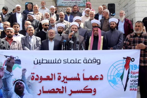 جاء ذلك خلال مؤتمر صحفي بعنوان: (موقف علماء فلسطين من مسيرة العودة وكسر الحصار)، نظمه علماء فلسطين من أمام مسجد الكتيبة بمدينة غزة اليوم الثلاثاء 27/3/2018 م.