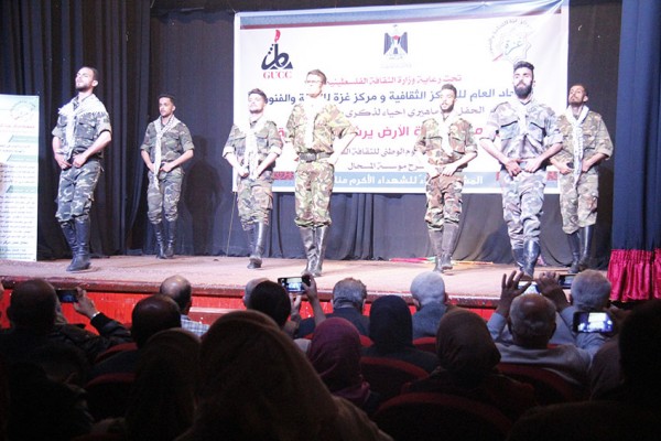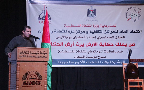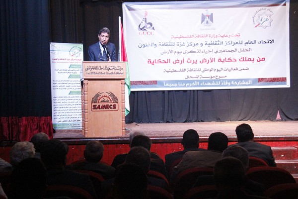 نظم الاتحاد العام للمراكز الثقافية و مركز غزة للثقافة والفنون إحتفال جماهيري مساء اليوم ،في الذكرة الثانية والاربعون ليوم الأرض الخالد بعنوان " من يملك حكاية الأرض يرث أرض الحكاية "في قاعة مسرح مؤسسة المسحال تحت رعاية وزارة الثقافة وضمن فعاليات اليوم الوطني للثقافة الفلسطينية، بحضور الأمين العام المساعد لاتحاد الكتاب والادباء الروائي الكبير غريب عسقلاني و الفنان التشكيلي فايز السرساوي وكيل وزارة الثقافة والأستاذ يسري درويش رئيس الاتحاد العام للمراكز الثقافية و عدد من المثقفين والكتاب والفنانين والشخصيات الاعتبارية .