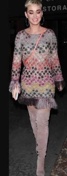 التقطت عدسات البابارتزي صوراً للنجمة العالمية كاتي بيري أثناء تناولها العشاء الخميس في أحد المطاعم الإيطالية في هوليوود، حيث ظهرت بفستان فضفاض أثار جدلاً واسعاً بين الجمهور، وتميز بألوانه المختلفة، وارتدت معه حذاءً من اللون الزهري.