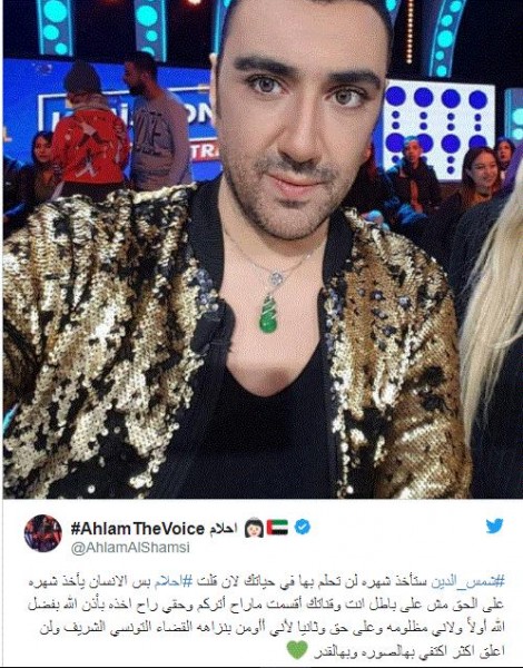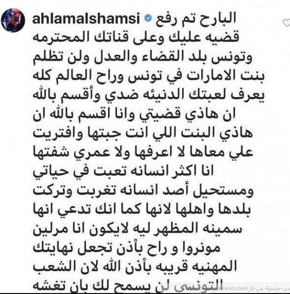 وتابعت بالقول: أقسمت اني ماراح اتركه وانا اثق بالقضاء التونسي الشريف النزيه وانه بينصرني عليه وعلى قناته وعلى المدعيه الكاذبه لتشويه صورتي امام الشعب اللي اعشقه الشعب التونسي وحسبي الله ونعم الوكيل فيه اقسم بالله انه كااااذب وانا مستحيل اكون عائقاً لمشتركه تركت بلدها واهلها لتنجح مش اخلاقي".