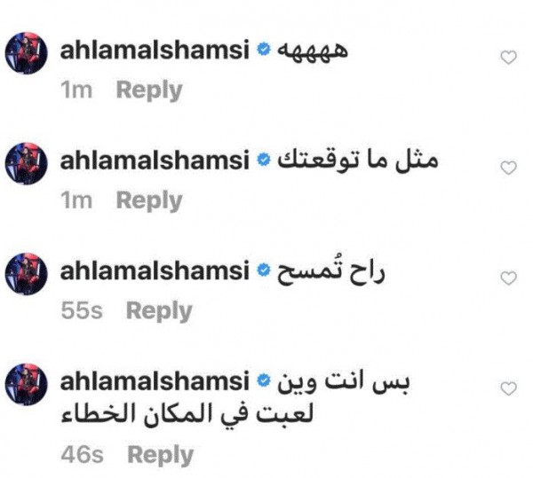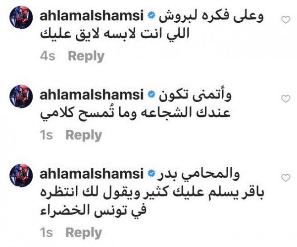 وكان باشا قد قام بحذف التعليقات التي كتبتها له أحلام على أحد صفحاته فما كان منها إلى أن ردّت بالقول:" هذا اول اثباتاتي للجمهور والشعب التونسي القدير واللي اعشقه واحترمه وأقدره اولا عمل لي بلوك لانه مش صادق وثانياً مسح كلامي كله له وتقدرون تشوفون حسابه ع الانستغرام وعموماً أقسمت اني ماراح أتركك يلي اسمك شمس الدين وهي ما راح اتركها الكذابه الثانيه اللي معاك القضاء بيننا حسبي الله ونعم الوكيل فيك ظلمتني وربي يأخذ حقي منك انت وياها هذا اول اثباتاتي للجمهور والشعب التونسي القدير واللي اعشقه واحترمه وأقدره..اولا عمل لي بلوك لانه مش صادق وثانياً مسح كلامي كله له وتقدرون تشوفون حسابه ع الانستغرام وعموماً أقسمت اني ماراح أتركك يلي اسمك شمس الدين وهي ما راح اتركها الكذابه الثانيه اللي معاك القضاء بيننا".