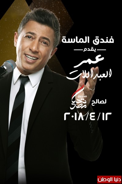 يستعد "صوت الأردن" الفنان الأردني عمر العبداللات لإحياء حفلاً غنائياً جماهرياً لصالح صندوق "تحيا مصر" بفندق الماسة، بمدينة نصر، يشاركه به الفنانين المصري الكبير عمرو دياب والتونسية القديرة لطيفة التونسية، وذلك يوم الخميس الموافق 12 إبريل 2018.