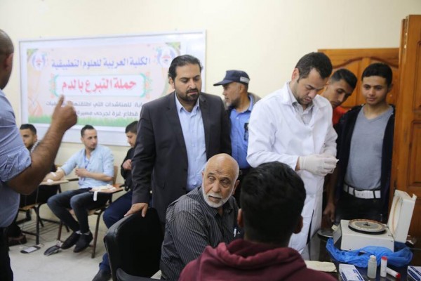 نظم قسم شؤون الطلبة في الكلية العربية للعلوم التطبيقية اليوم الأربعاء 2018/4/4 ، بالتعاون مع جمعية بنك الدم المركزي، حملة للتبرع بالدم تحت عنوان ( قطرة دم تساوي حياة ) في إطار المناشدات التي دعت إليها مستشفيات القطاع للتبرع بالدم من أجل مصابي مواجهات مسيرة العودة الكبري علي الحدود الشرقية لقطاع غزة ، وحظيت بقبول واسع من قبل الهيئة الإدارية والتدريسية وطلاب وطالبات الكلية الذين حرصوا على التبرع بدمائهم من أجل إنقاذ حياة المصابين .