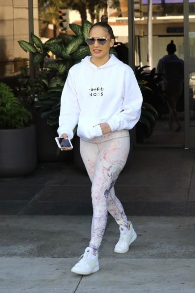 في المشاوير الصباحية غالباً ما تختار “جينيفر لوبيز” Jennifer Lopez الاطلالات في الملابس الرياضية، فتختار البناطيل المطاطية الضيقة وتنسق معها القمصان القطنية الفضافضة أو التيشيرت القصيرة مع الأحذية الرياضية، ودائماً تتميز هذه الاطلالات بالجرأة الشبابية.