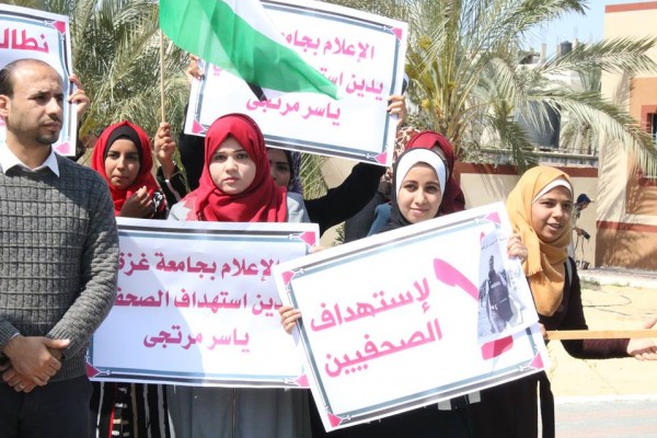 ورفع المشاركون لافتات منددة بجرائم الاحتلال في استهداف الصحفيين الفلسطينيين مطالبين بضرورة توفير الحماية الدولية لهم, مستنكرين استهدافهم المتعمد والمباشر. وقال محاضر الاعلام أ. خليل عطاالله "إن طلبة الإعلام ينعون شهيد الصورة والحقيقة الشهيد الصحفي "ياسر مرتجى" الذي استشهد في جريمة إسرائيلية بشعة أثناء تغطيته للفعاليات الاحتجاجية السلمية في المناطق الحدودية"