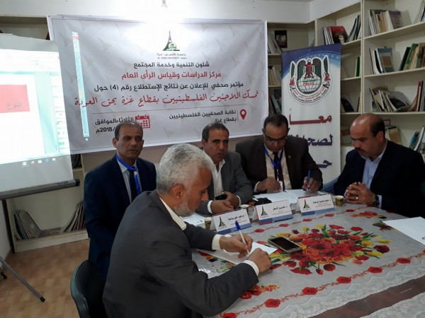 ومن جانب آخر أعلن أ. إبراهيم خليل صالحة مدير مركز الدراسات وقياس الرأي العام في جامعة الأقصى نتائج الاستطلاع الرابع الذي أجراه مركز الدراسات وقياس الرأي في جامعة الأقصى بغزة خلال الفترة الواقعة ما بين 30-3/6-4 2018؛ حيث قامت جامعة الأقصى بتمويل ذاتي في إجراء هذا الاستطلاع كاملاً؛ مشيراً إلى أن الاستطلاع تناول آراء الشارع الفلسطيني في مدى تمسكهم بحق العودة، وخصوصا بعد إعلان الرئيس الأمريكي صفقة القرن، والتي تؤثر بشكل مباشر على قضية اللاجئين، كما أكد أ. إبراهيم صالحة أن حجم عينة الاستطلاع 1739 شخصاً ممن بلغت أعمارهم 18 سنة فأكثر، وهم الذين لهم حق الانتخاب. وقد تم توزيع هذه الاستمارة في جميع مناطق محافظات قطاع.