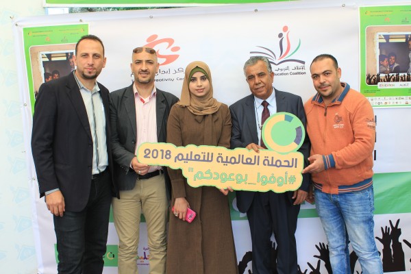 هذا واستعرض ممثل عن أعضاء الائتلاف التربوي الفلسطيني الأستاذ عماد الحطاب مدير الدائرة الثقافية في جمعية الهلال الأحمر ورقة موقف الائتلاف التربوي من الحملة والمطالب التي تنادي بها لعام 2018 منها: توفير 12 سنة من التعليم المجاني والالزامي النوعي والمنصف، الممول من القطاع العام، وضع خطط ذات مصداقية لتمويل خطة التعليم لعام 2030 بالكامل- بما في ذلك من خلال العمل على العدالة الضريبية وحصة الميزانيات التي يتم إنفاقها بحساسية وشفافية، تحقيق رؤية التعليم المجاني المنصف النوعي والشامل للجميع وذلك يحقق مفهوم واسع لجودة التعليم، زيادة نسبة التمويل المحلي للتعليم وما يرافقه من ضرورة لإعادة النظر بقانون ضريبة الدخل وضريبة المعارف تعديل الشرائح الضريبية وفرض الضريبة على الأرباح الرأسمالية مما يكفل العدالة الاجتماعية في المجتمع، المطالبة بالإعمال الكامل للالتزام بزيادة الإمداد بالمعلمين المؤهلين "وضمان أن المعلمين والمربين يتم تمكينهم وتعيينهم على نحو كاف ومدربين تدريباً جيداً ومؤهلين مهنياً ومتحمسين ومدعومين في إطار نظم مزودة بموارد كافية وفعالة ومحكومة بفاعلية"، دعم مشاركة المجتمع المدني الشاملة في الوقت المناسب في التنفيذ الكامل للهدف الرابع من أهداف التنمية المستدامة على المستويات الوطنية والإقليمية والدولية، زيادة الإنفاق لتعزيز المساواة والشمول والتعليم النوعي للمتعلمين من الفئات المهمشة مثل الأشخاص ذوي الإعاقة ، والمجتمعات الريفية ، ضمان آليات ذات مصداقة وشفافة لمشاركة المجتمع المدني في عمليات الرصد والمحاسبة بشأن اجندة التعليم 2030.