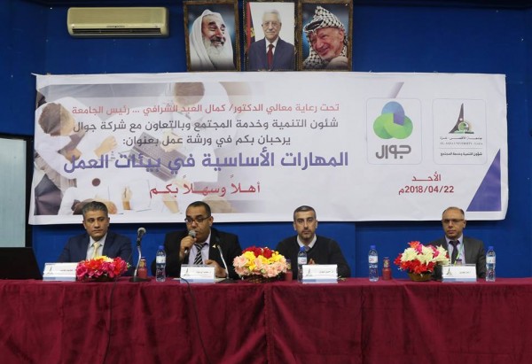 نظمت شؤون التنمية وخدمة المجتمع بجامعة الاقصى ورشة عمل بعنوان : " المهارات الأساسية في بيئات العمل " و ذلك برعاية رئيس الجامعة د. كمال العبد الشرافى , و بالتعاون مع شركة جوال.