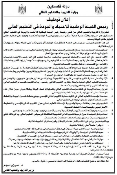 جاء ذلك في رسالة بعثها ائتلاف أمان إلى كل من وزير التربية والتعليم العالي د. صبري صيدم ورئيس الوزراء د. رامي الحمد الله، ثمّن فيها قيام وزارة التربية والتعليم بنشر الإعلان عن وظيفة رئيس الهيئة الوطنية للاعتماد والجودة، الامر الذي من شأنه أن يرسخ مبدأ تكافؤ الفرص لتقلد المناصب العليا والمنافسة العادلة بين الفلسطينيين، داعياً إلى أن تكون هذه المبادرة نموذجا يحتذى في تعزيز شفافية الوزارات والحكومة الفلسطينية سيما في تعيينات الوظائف العليا.
