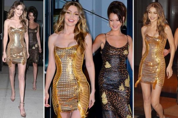 ارتدت نجمة الحفل جيجي حديد فُستان ميتاليك لونه ذهبي، كشف عن جسدها الرّشيق، فتصميمه من الناحية العلوية جاء سترابلس أي من دون أكتاف، وطوله الذي وصل إلى أعلى الفخذين، كما انتعلت معه كعبا عاليا لونه ذهبي أيضاً.