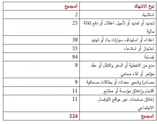 ولتسليط الضوء على صورة حرية الإعلام في فلسطين وبمناسبة اليوم العالمي لحرية الصحافة ،أعد فريق الرصد ومتابعة الانتهاكات بمركز غزة لحرية الإعلام إحصائية منذ مطلع العام الجاري2018 ما مجموعه ( 266) انتهاكا ضد الحريات الإعلامية في فلسطين, ارتكبت قوات الاحتلال الإسرائيلي (224) انتهاكا, في حين ارتكبت جهات فلسطينية في الضفة الغربية وقطاع غزة ما مجموعه (42) انتهاكا.