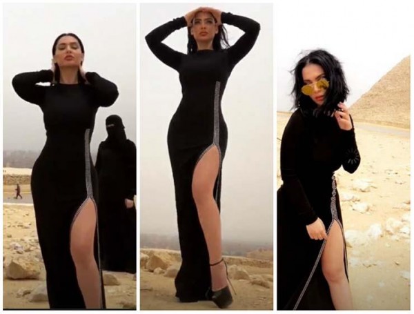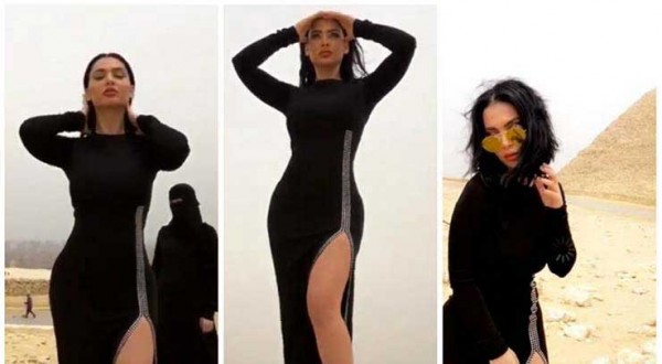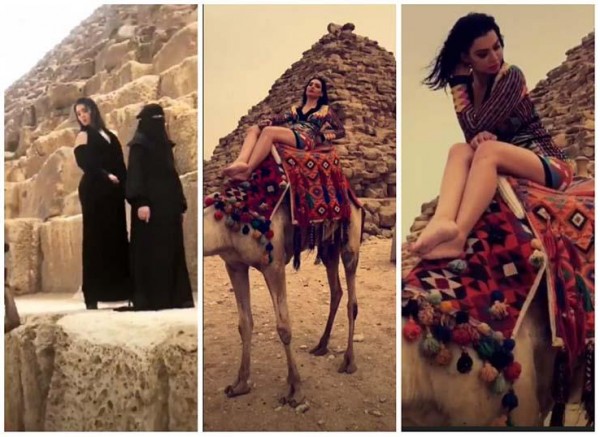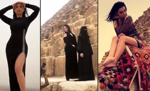 الفنانه قمر تثير الجدل في جلسة تصوير مع منقبات في الاهرامات