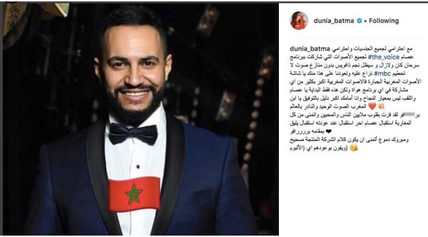 وقالت: "مع احترامي لجميع الجنسيات واحترامي لجميع الأصوات التي شاركت ببرنامج (#the_voice)عصام سرحان كان ولازال و سيظل نجم ذافويس بدون منازع صوت لا نزاع عليه وتعودنا على هذا منك يا شاشة (#mbc) تحطيم الأصوات المغربية الجبارة فالاصوات المغربية اكبر بكثير من اي مشاركة في اي برنامج هواة ولكن هذه فقط البداية يا عصام واللقب ليس بمعيار النجاح وانا أمامك اكبر دليل بالتوفيق يا ابن المغرب الصوت الوحيد والنادر بالعالم"، بحسب "نورت".