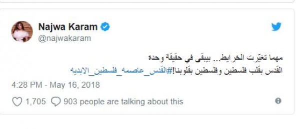 كما نشرت شمس الأغنية نجوى كرم عبر حسابها على تويتر منشوراً استنكرت به ما يحصل في فلسطين بالقول "مهما تغيّرت الخرايط... بيبقى في حقيقة وحدة، القدس بقلب فلسطين وفلسطين بقلوبنا! #القدس_عاصمه_فلسطين_الابديه"