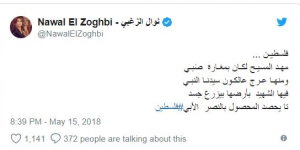 من ناحيتها، أبدت النجمة الذهبية نوال الزغبي غضبها مما يحصل في حقّ الفلسطينيين بكتابة التالي عبر تويتر "فلسطيـن ...مهـد المسيـح لكـان بمغـارة صَبـي، ومنهـا عـرج عالكـون سيدنـا النبـي، فيها الشهيد بأرضها بيزرع جسد، تا يحصد المحصول بالنصر الأبي #فلسطين."