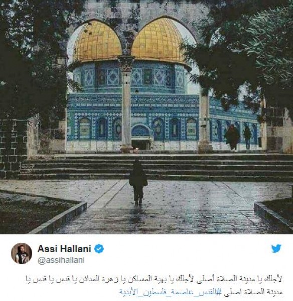 في هذا السياق، نشر فارس الأغنية العربية عاصي الحلاني صورة عبر حسابه الرسمي على تويتر للمسجد الأقصى وعلّق عليها بالقول "لأجلك يا مدينة الصلاة أصلي لأجلك يا بهية المساكن يا زهرة المدائن يا قدس يا قدس يا مدينة الصلاة اصلي #القدس_عاصمة_فلسطين_الأبدية."
