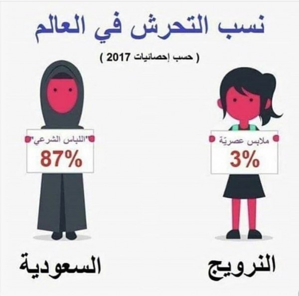 وتقول الإحصائية مجهولة المصدر والتي تعود للعام الماضي 2017، إن نسب التحرش الجنسي في النرويج حيث ترتدي النساء هناك ملابس "عصرية" تبلغ 3%، فيما تبلغ في السعودية " 87%.