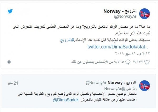 ودخلت النرويج على الخط من خلال حساب "النرويج باللغة العربية" الرسمي منتقدة بشدة الإحصائية التي نشرتها الإعلامية اللبنانية، وطالبت بتوضيح حقيقة المنسوبة للنرويج.