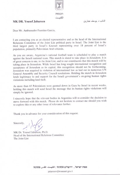 توجه النائب د. يوسف جبارين، رئيس لجنة العلاقات الدولية بالقائمة المشتركة، برسالة الى السفير الأرجنتيني في البلاد، فاوستينو چارسيا، طالب فيها الارجنتين بالعدول عن اقامة المباراة مع منتخب إسرائيل، المقرر إقامتها في القدس يوم السبت القادم.