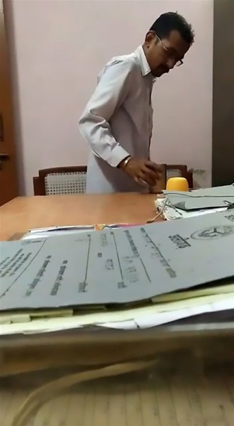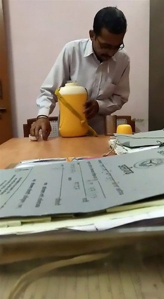 ظهر الموظف ينظر حوله للتأكد من أنه بمفرده داخل الغرفة، لكنه لم يكن يعلم أن إحدى الكاميرات رصدته وهو يبصق في كوب الماء قبل تسليمه للمديرة.