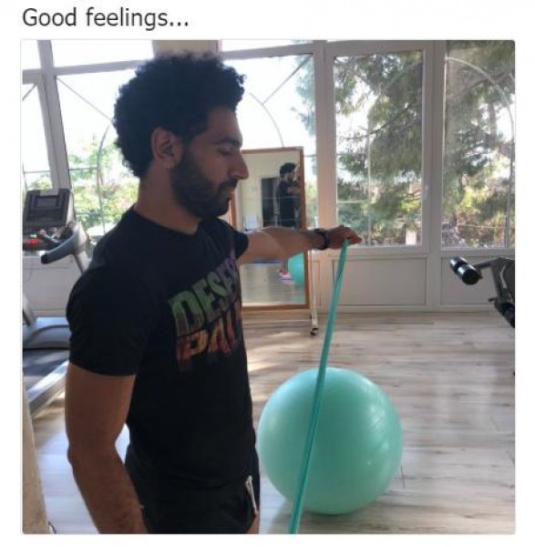 ونشر محمد صلاح في حسابه الرسمي على تويتر اليوم الأحد صورة جديدة له وهو يقوم بإجراء بعض التمارين العلاجية كتب فوقها : "مشاعر جيدة".