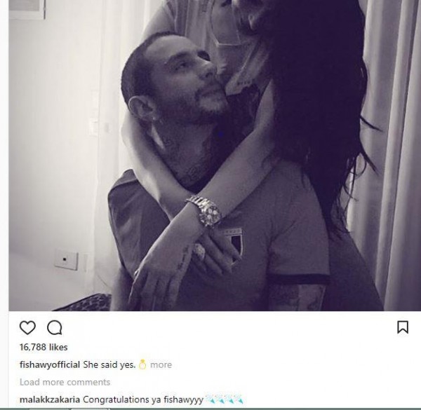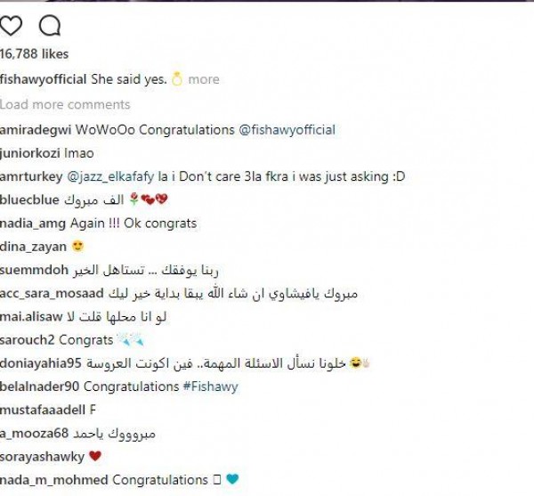 كشف الفنان أحمد الفيشاوي عن عروسته الجديدة، وذلك عبر حسابه الخاص على موقع التواصل الاجتماعي انستجرام، ونشر صورة تجمعه بحبيبته، وكتب تعليقًا يعبر عن استعدادهما للزواج:"she said yes".