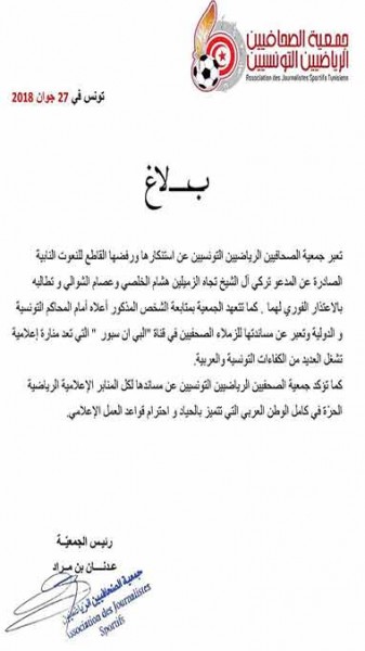 وتعهدت، في بيانها، بمتابعة آل الشيخ أمام المحاكم التونسية والدولية. كما عبرت عن مساندتها للصحفيين في (beIN) الرياضية التي تعد منارة إعلامية تشغل العديد من الكفاءات التونسية والعربية، وفق تعبير البيان الذي نشرته قناة (الجزيرة).