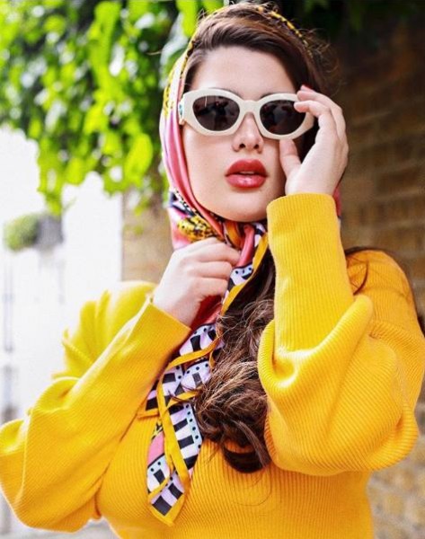 وهنا أكملت روان إطلالتها بإكسسوارات هي عبارة عن وشاح الرأس المتداخل الألوان، والنظارة الشمسية البيضاء.
