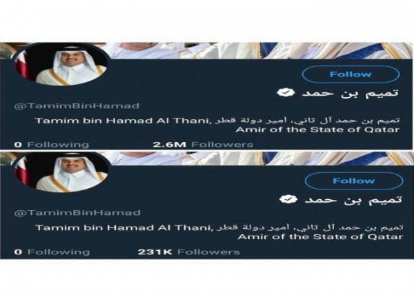 طالت حملة "تويتر" تستهدف الحسابات المزيفة أمير قطر الشيخ تميم بن حمد آل ثاني، حيث تهاوى عدد متابعي الأمير القطري من أكثر من مليونين ونصف المليون متابع إلى 231 ألف متابع فقط، بعد حذف الحسابات الوهمية.