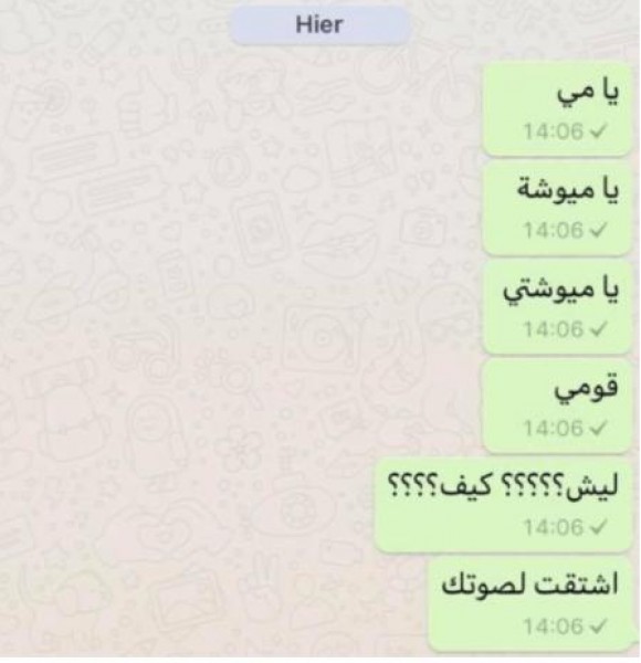 وبدا في الرسالة أن ديمة تحاول التعبير عن عدم تصديقها لغياب مي من خلال التحدث إليها بطريقة مؤثرة جداً. ومما كتبت: "يا مي، يا ميوشة، يا ميوشتي، قومي. ليش؟ كيف؟ اشتقت لصوتك".