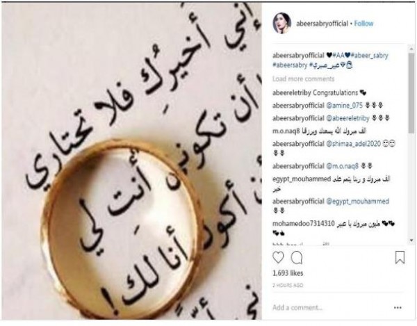 شاركت الفنانة عبير صبري صورة علي حسابها الشخصي علي موقع التواصل الاجتماعي "انستجرام" في أول تعليق لها علي خبر زواجها من المحامي الدولي "أيمن البياع".