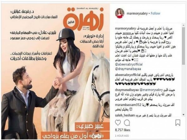 وهنأتها شقيقتها "مروة" في بصورة لـ"عبير" علي غلاف إحدي المجلات الخليجية بخبر زواجها قائلة:"مبروك يا أحلي وأجمل عروسة في الدنيا.. ربنا يسعدكم ويخليكم لبعض يا أحلي عرسان".