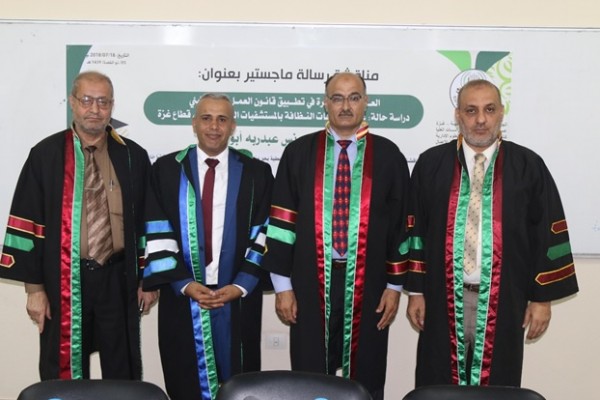 ناقشت عمادة البحث العلمي والدراسات العليا وكلية الاقتصاد والعلوم الإدارية في الجامعة الإسلامية بغزة، رسالة ماجستير مقدمة من الباحث/ باسم يونس أبو جري بعنوان " العـــــوامل المـؤثرة في تطــبيق قانـون العمـل الفلسـطيني دراسـة حـالة: عمـال شـركات النـظافة بالمستشفيات الحـكومية في قطـاع غــزة"