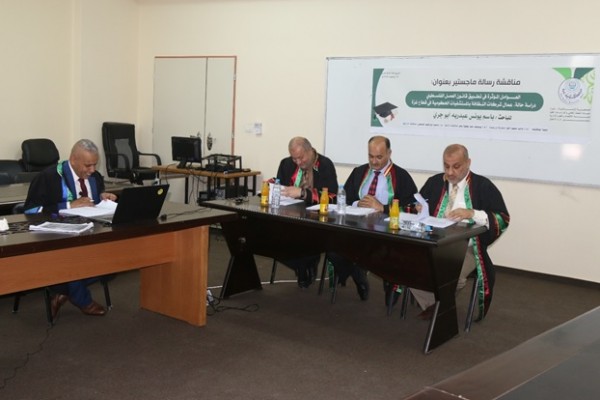 وتشكلت لجنة المناقشة -التي عقدت جلستها في قاعة الاجتماعات بكلية الاقتصاد والعلوم الإدارية-من الأستاذ الدكتور/ ماجد محمد الفرا-مناقشاً ورئيساً، والأستاذ الدكتور/ يوسف عبد عطية بحر-مشرفاً داخلياً، والدكتور/ محمد إبراهيم المدهون-مناقشاً خارجياً.