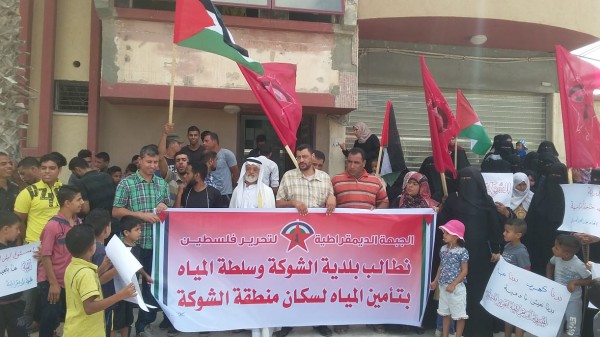 نظمت الجبهة الديمقراطية لتحرير فلسطين اليوم اعتصاماً مطلبياً أمام بلدية الشوكة برفح جنوب قطاع غزة للمطالبة بتوفير مياه لأهالي وسكان المنطقة منقطعة عنهم منذ أكثر من أسبوع وبصورة مستمرة.