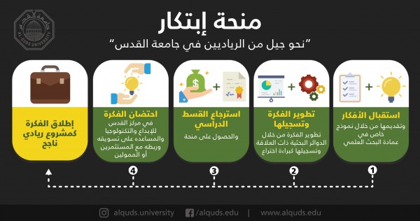 دعما لثقافة الابتكار وتشجيعا للريادية بين الشباب كنهج من شأنه المساهمة بشكل كبير في مواجهة التحديات التي تعصف بالمجتمع الفلسطيني، اعلن رئيس جامعة القدس الاستاذ الدكتور عماد ابو كشك عن تأسيس برنامج منحة "ابتكار" وذلك بتمويل من الجامعة، وهو برنامج الاول من نوعه في فلسطين، تضمن حصول الطلبة على اعفاء كامل من اقساطهم الدراسية، واستعادة ما قاموا بدفعهم خلال الدراسة، في حال نجاح الطالب في تقديم ابتكار في اي مجال من المجالات العلمية، تكون قابلة للتسجيل كبراءة اختراع، وتكون ذات اثر اجتماعي تعود بالنفع على المجتمع بشكل عام كونها تقدم حلولا ابتكارية لمعضلة مجتمعية، وذلك في اطار ما يعرف بالابتكارات المجتمعية social innovation.