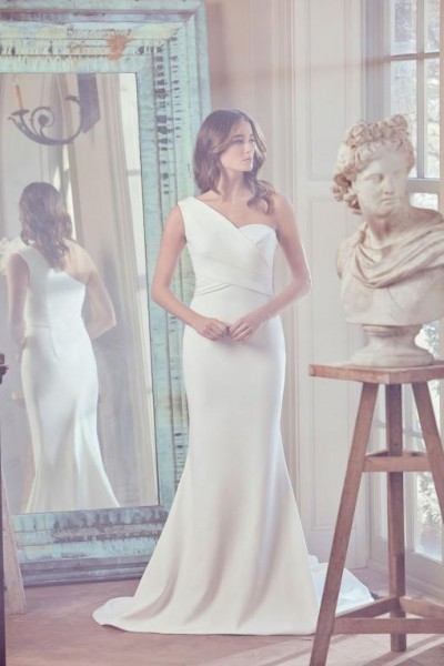 يمكن اختيار فستان زفاف بقصّة عمودية، ولكن واسعة قليلاً بحيث لا تبرز الساقين، مثل فستان زفاف Liancarlo وفستان زفاف نعيم خان Naeem Khan.
